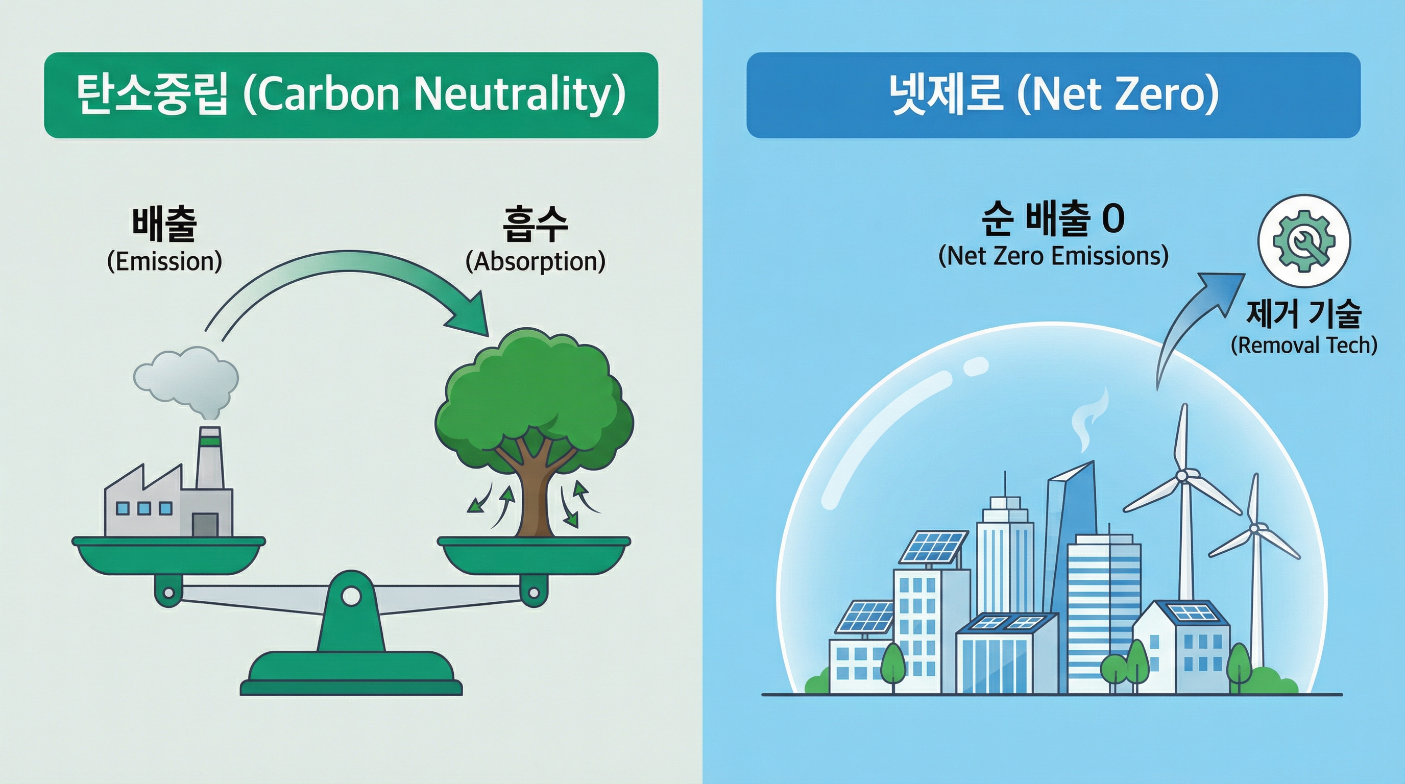 | 구분 | 탄소중립 (Carbon Neutrality) | 넷제로 (Net Zero) |
